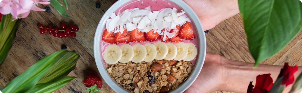 Base cremosa de plátano, mango y leche vegetal, decorada con granola casera, semillas y frutas de temporada. Un desayuno refrescante, lleno de energía natural, y con los mejores sabores de la isla. Perfecto para días calurosos o después de surfear.